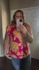 This top features a pink background with a beautiful, yellow floral design and ruffle sleeves. A perfect addition to any wardrobe for a sophisticated and stylish look. It is very stretchy and buttery soft! Haylee is wearing size small, Sarah is wearing a 1XL. 95% polyester and 5% spandex.